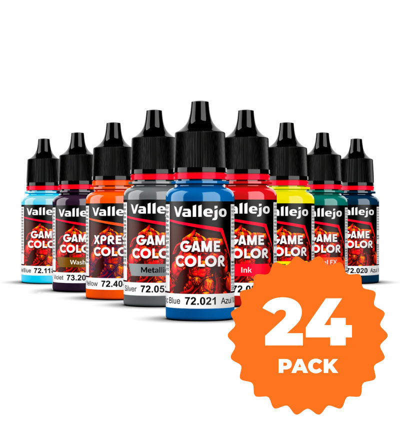 El Pack 24 Game Color Vallejo es la forma más rápida y económica de reunir los colores que usas de verdad. Elige 24 pinturas de la gama Game Color, activa el descuento del pack y pinta tus miniaturas con una paleta coherente, lista para base, sombras y luces en un solo pedido.
