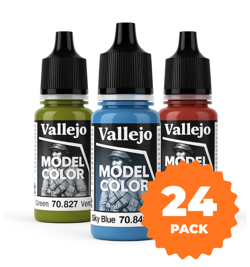 El Pack 24 Model Color Vallejo es la forma más rápida y económica de reunir los tonos que realmente usas. Elige 24 pinturas de la gama Model Color, activa el descuento del pack y pinta tus maquetas y figuras con una paleta coherente, lista para bases, luces y envejecidos en un solo pedido.